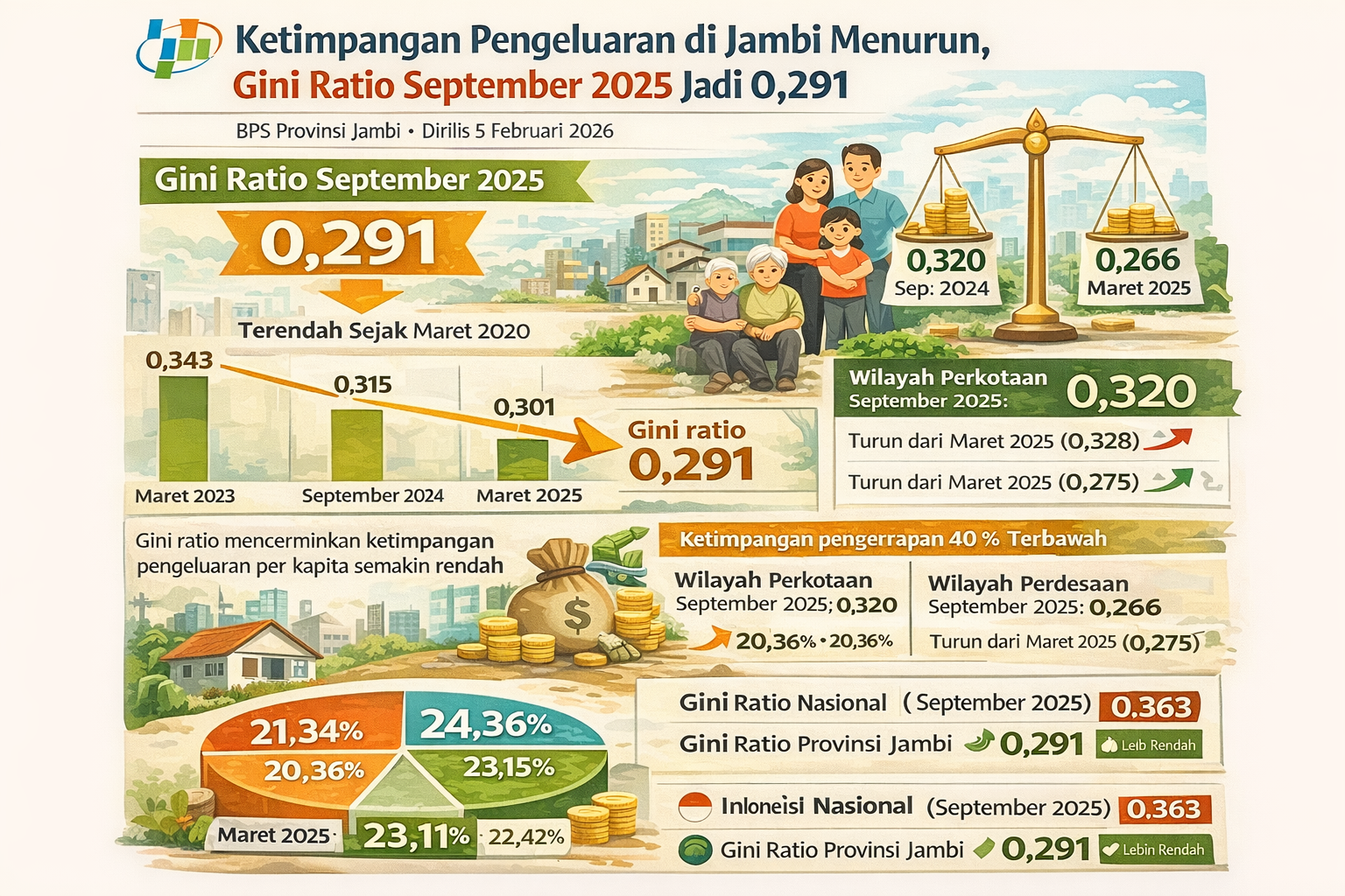 Secara nasional, gini ratio Indonesia pada September 2025 tercatat 0,363. Dengan capaian 0,291, Provinsi Jambi berada di bawah rata-rata nasional dan termasuk daerah dengan tingkat ketimpangan yang relatif rendah dibandingkan sejumlah provinsi lain di Indonesia.