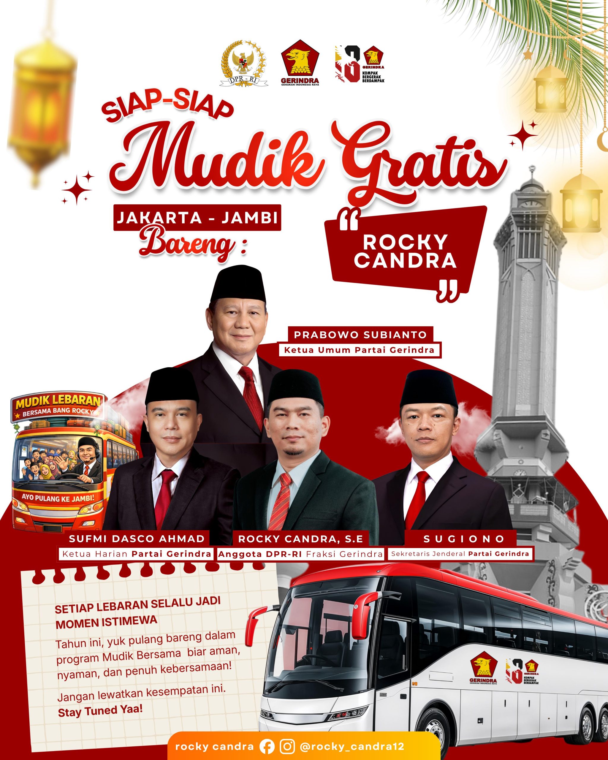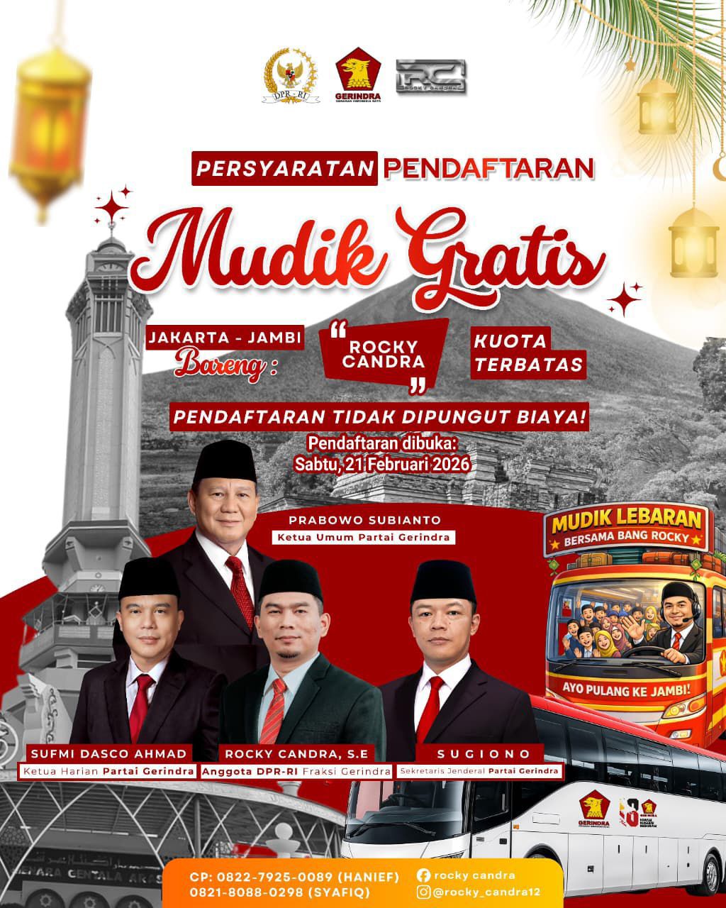 JBCNEWS.ID – Kabar gembira bagi masyarakat Jambi yang berencana pulang kampung saat Lebaran. Anggota DPR RI Komisi XII, Rocky Candra, menyiapkan program “Mudik Gratis Bareng Rocky Candra” yang pendaftarannya akan dibuka pada hari Sabtu 21 Februari 2026.